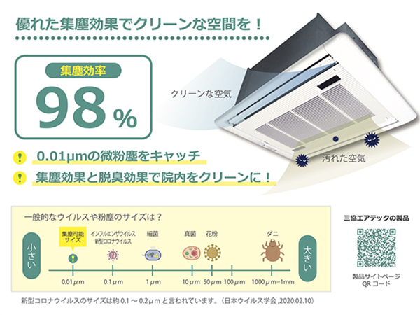 当院では、新型コロナウイルスやインフルエンザ等の感染予防のため「電子式エアクリーナ−」を導入し、院内感染防止対策を行っております。